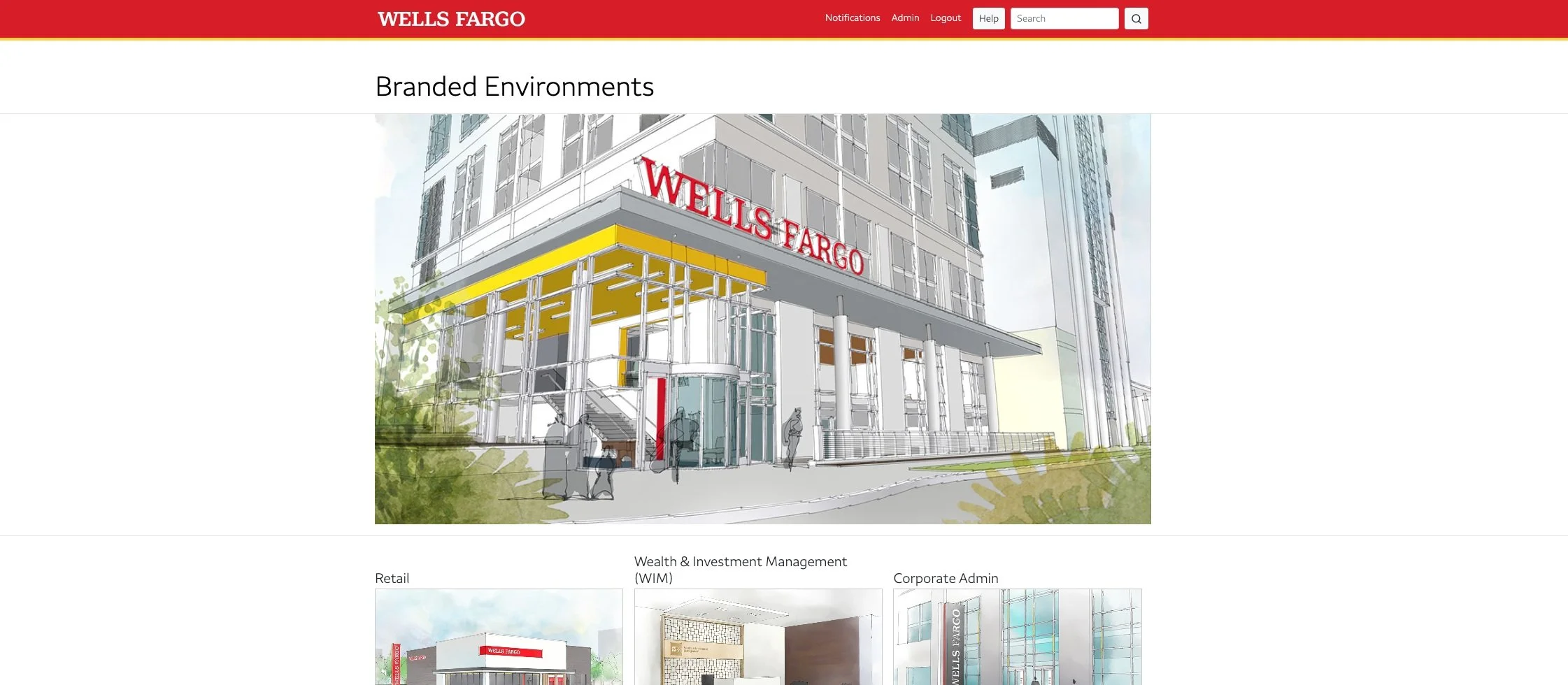 A one of a kind industry focused web app was developed to house all design intent drawings, technical specifications, artwork, and application guidelines of the environmental brand elements developed by Kraido for Wells Fargo. This initial tool was constructed using Drupal, an open source content management system. The front-end user experience was built using Bootstrap for a mobile-first, responsive framework in order to be accessed from any device.